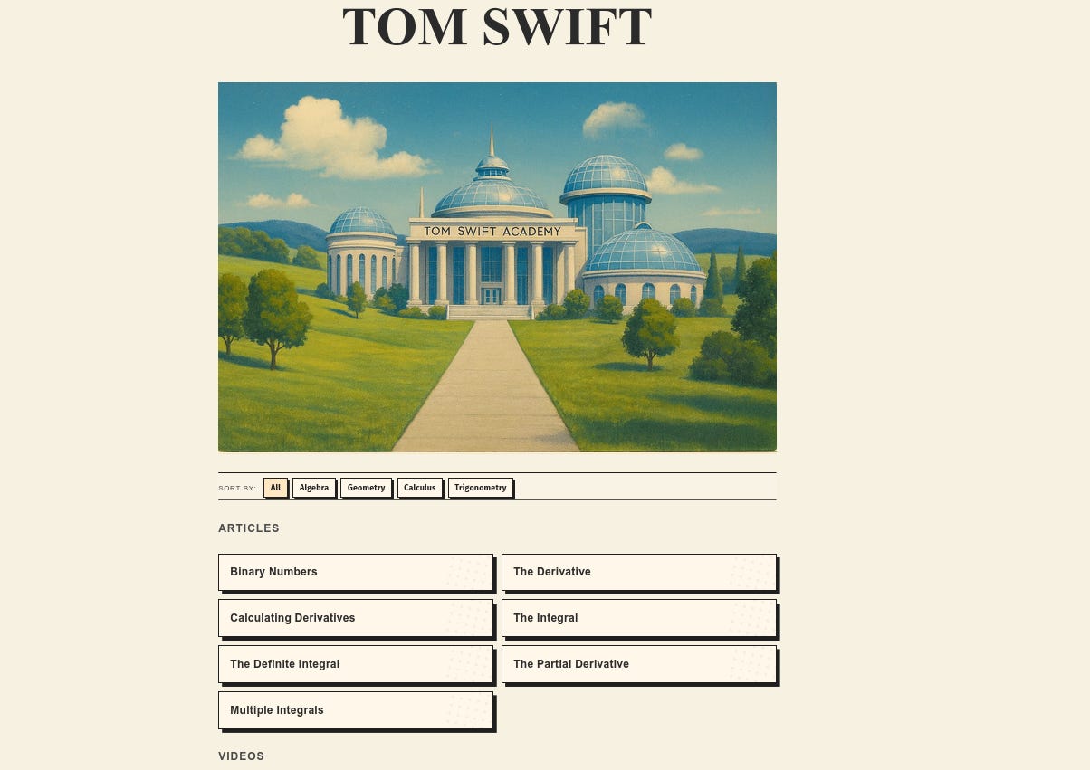 Yet expository material only takes one so far. The best benefit available to our paid subscribers is this library of all Tom Swift educational content, consisting of a searchable database of these videos and articles, and interactive units covering mathematics from algebra to differential equations. Upgrade to learn more.